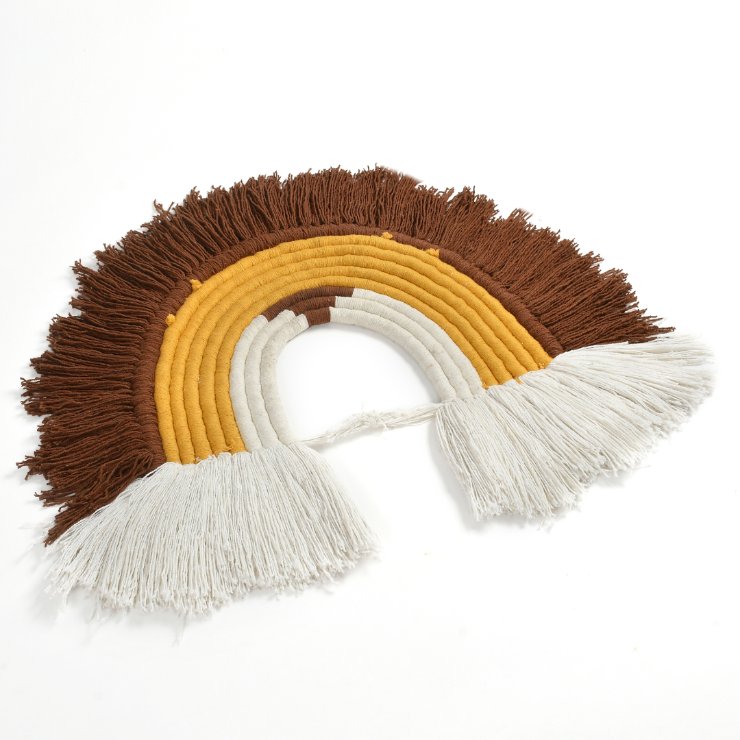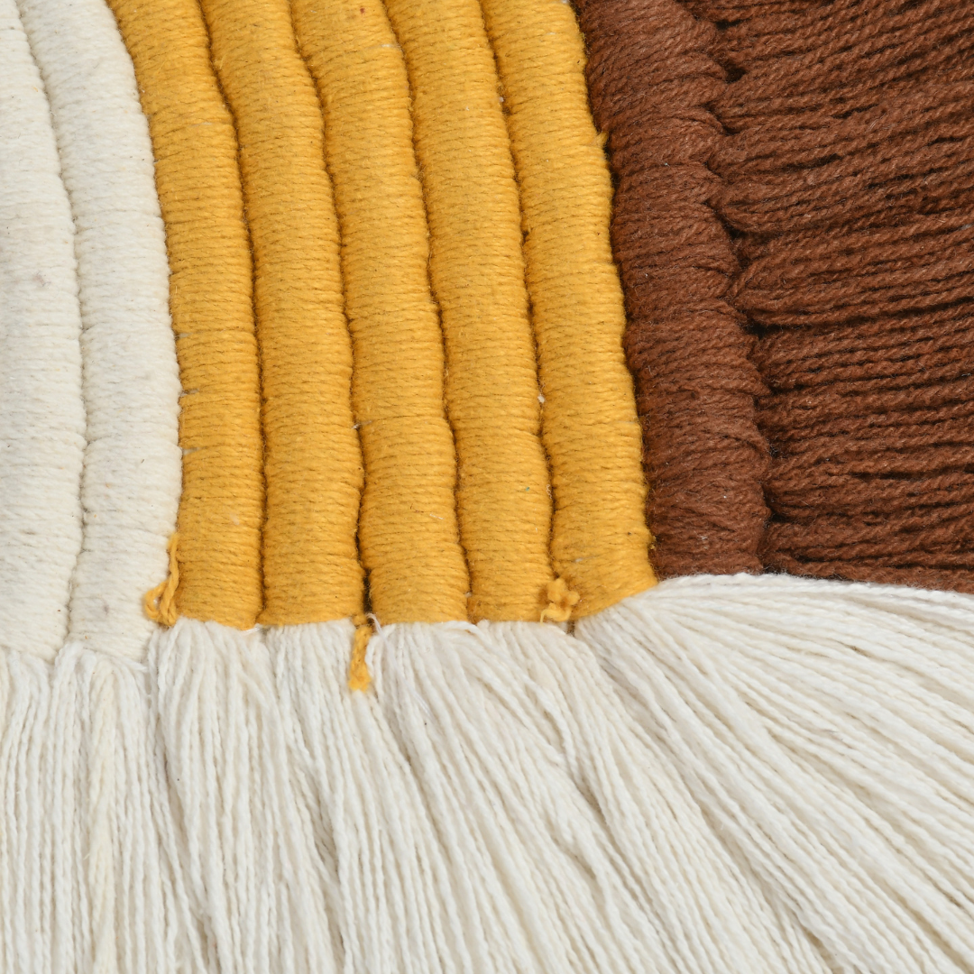 Thoughtfully handcrafted with cotton cords in rich earthy browns, warm mustard, and soft cream tones, this wall accent adds a touch of boho charm to any corner. Its soothing palette and fringe detailing evoke the beauty of sunset hues, creating a calm and inviting ambiance for your home.